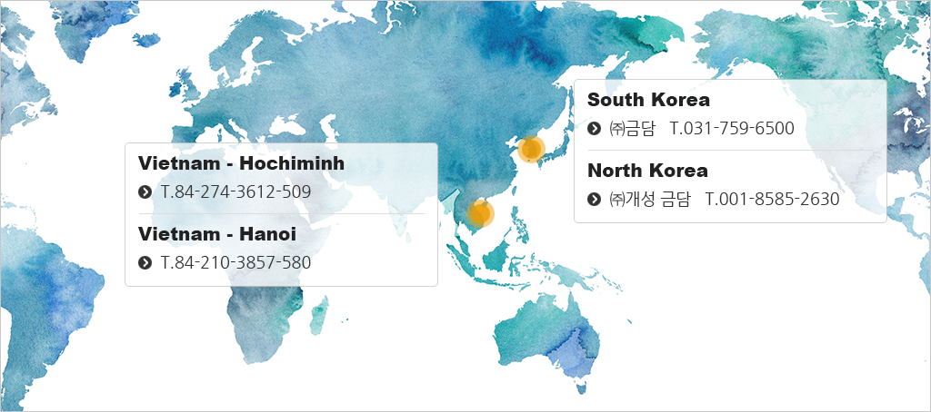 국내를 넘어 세계로, 최고를 향해 나아가고 있습니다. 금담은 국내 본사를 중심으로 개성, 베트남, 인도네시아 등 최고를 향해 나아가고 있습니다.